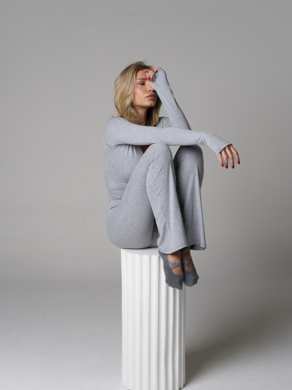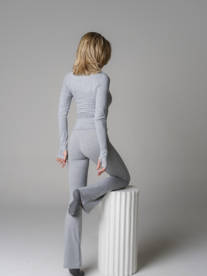 The wrap-style top ties at the waist with long sleeves and thumb holes, paired with high-waist flared bottoms for a flattering silhouette.