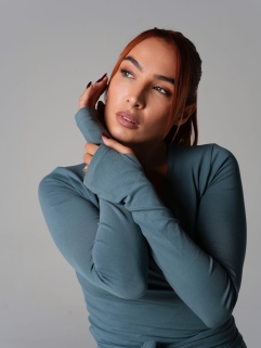 The wrap-style top ties at the waist with long sleeves and thumb holes, paired with high-waist flared bottoms for a flattering silhouette.
