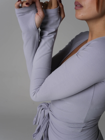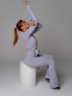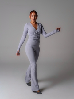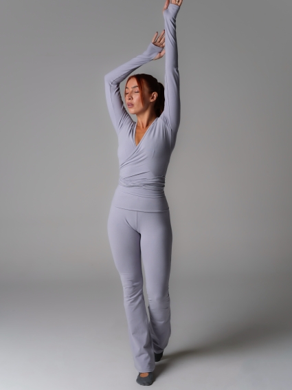 The wrap-style top ties at the waist with long sleeves and thumb holes, paired with high-waist flared bottoms for a flattering silhouette.