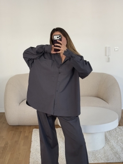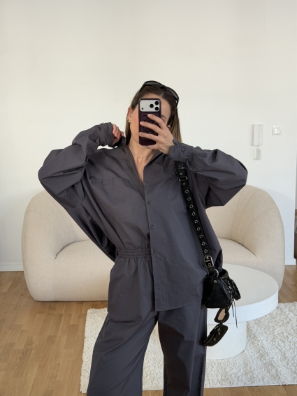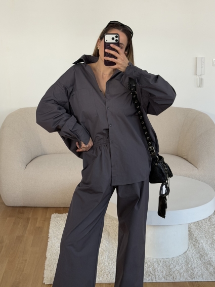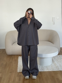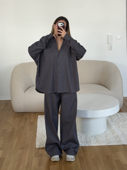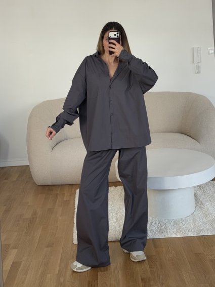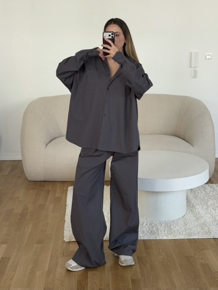 This oversized poplin set pairs a relaxed shirt with wide-leg pants for a modern silhouette, finished with an embroidered “Twnty” logo on the front pocket.